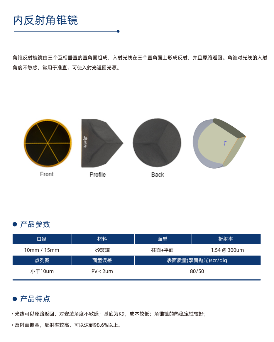 角錐反射棱鏡由三個(gè)互相垂直的直角面組成,入射光線在三個(gè)直角面上形成反射,并且原路返回。角錐對(duì)光線的入射角度不敏感,常用于準(zhǔn)直,可使入射光返回光源。