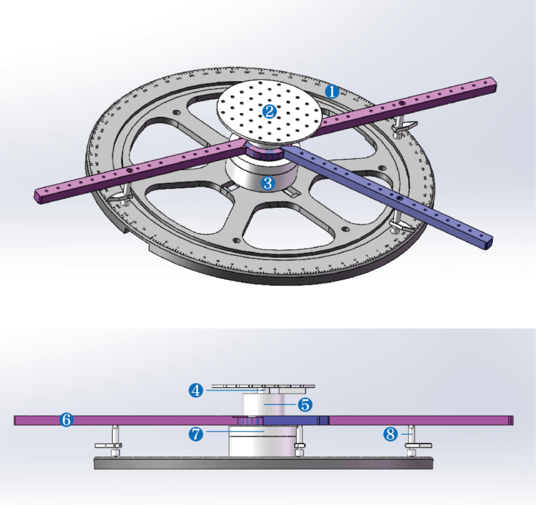 ① 底盤:用于承載和固定整套裝置,上面刻有角度刻度,可便于人工讀取旋轉(zhuǎn)角度,并可用于校對(duì)角度編碼器顯示角度;